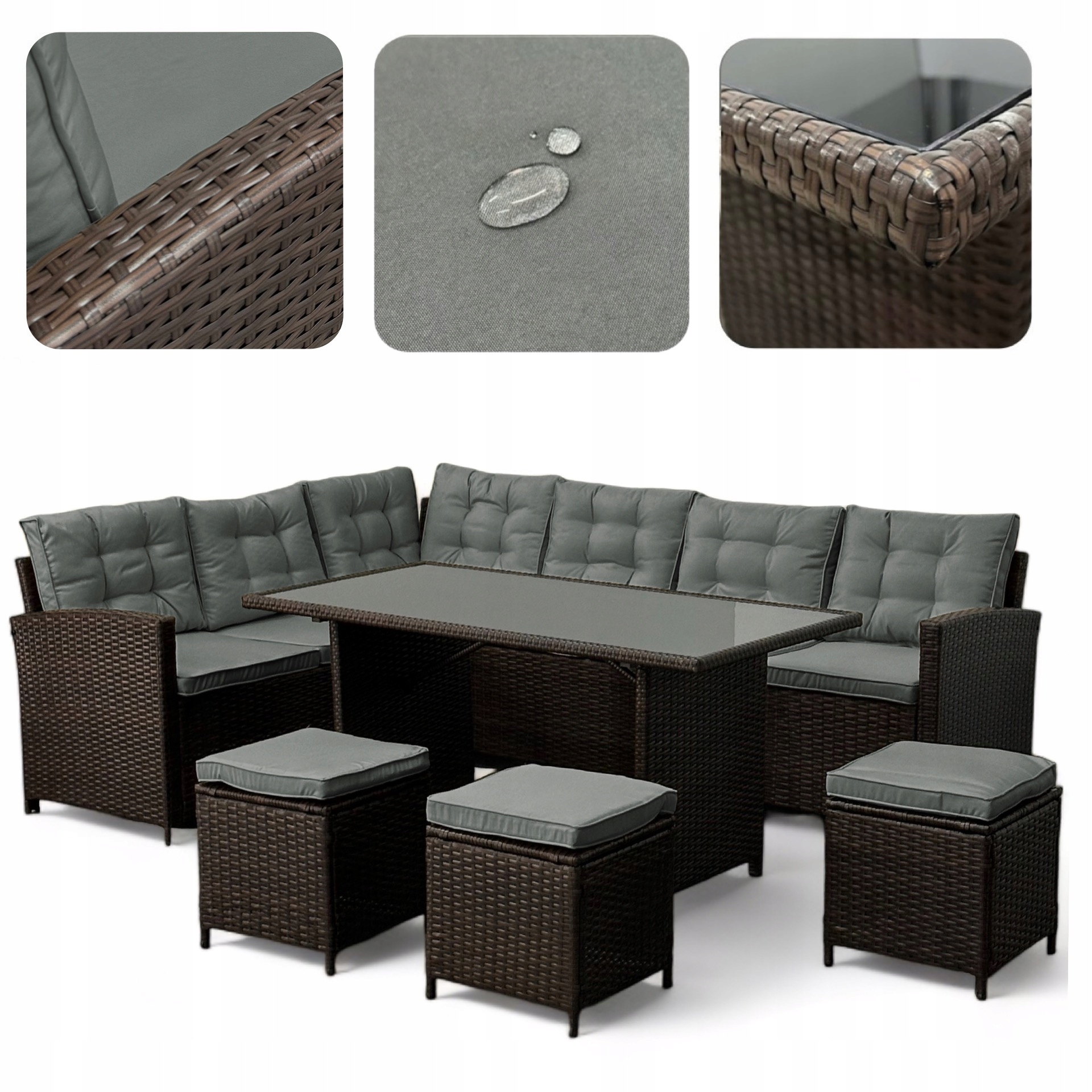 Ten imponujący zestaw jadalniany z narożnikiem i aż trzema pufami to propozycja dla tych, którzy nie uznają kompromisów w kwestii miejsca i wygody. Zaprojektowany, by swobodnie pomieścić nawet 9 osób, stanie się sercem Twojego ogrodu, tarasu lub altany.